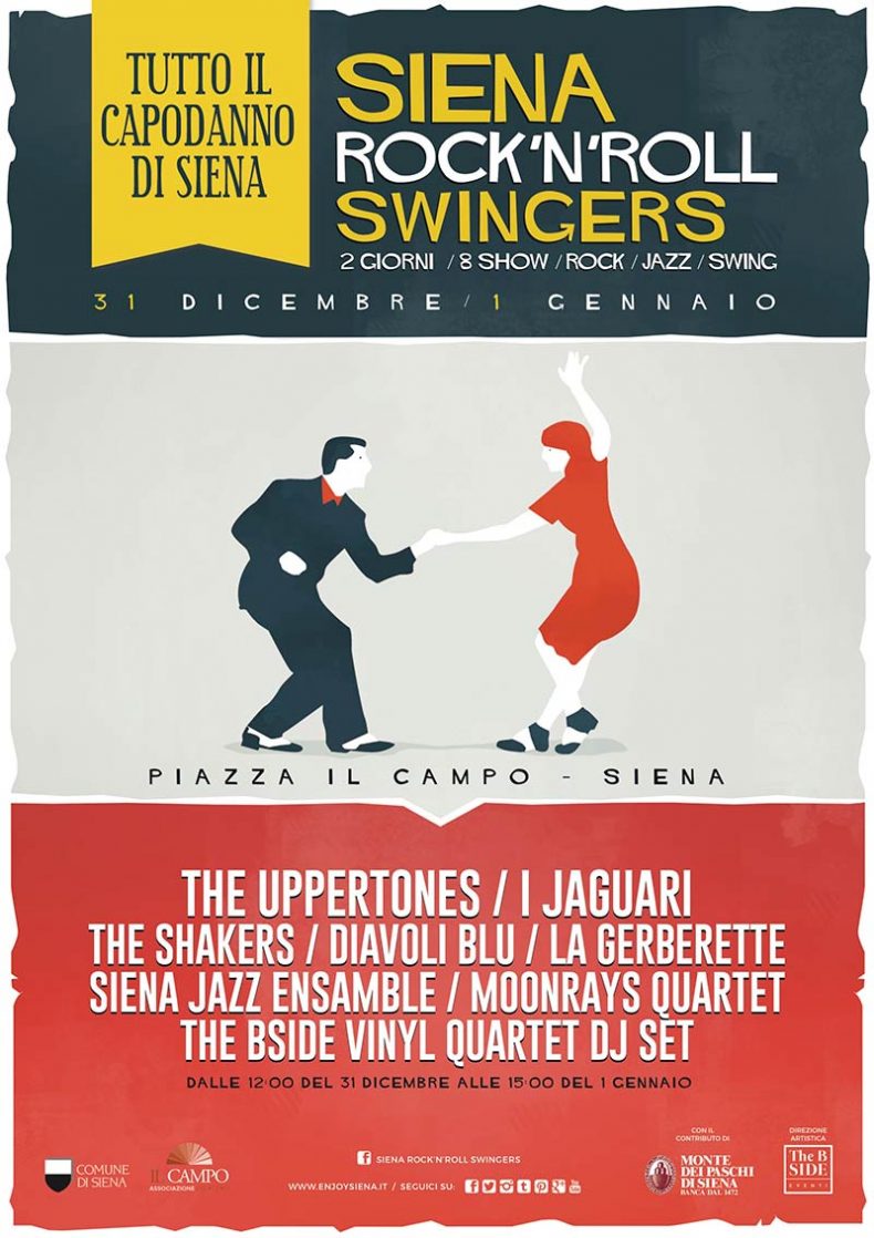 Sabato 31 dicembre i festeggiamenti inizieranno sin dalle 12:00 con il primo di una lunga serie di concerti gratuiti in Piazza del Campo: quest’anno, infatti, è in programma la manifestazione Siena Rock’n Roll Swingers, una celebrazione musicale con esibizioni di band che suoneranno r’n’r, swing, jazz, beat italiano, musica caraibica e blues del delta.